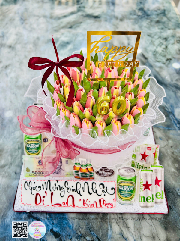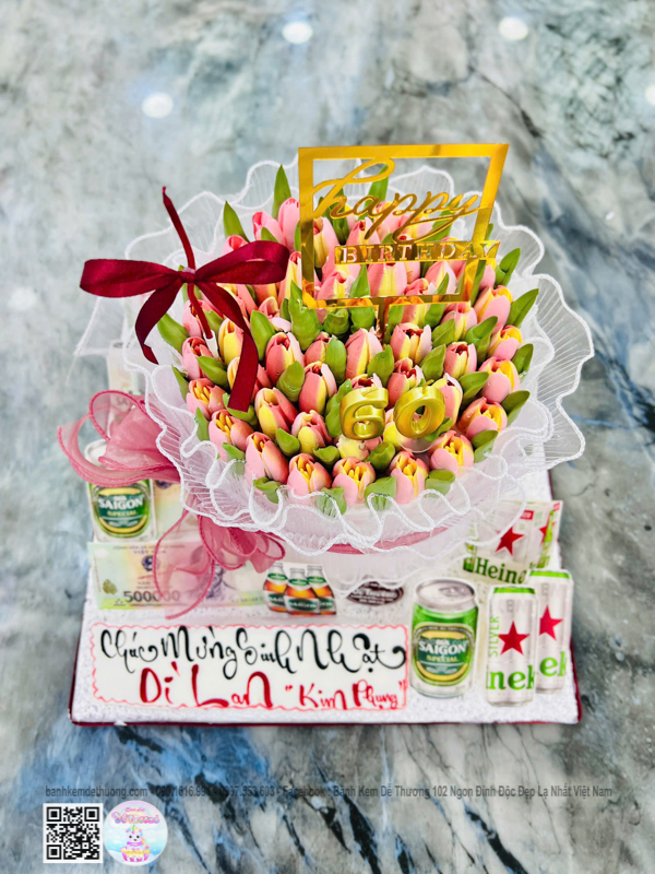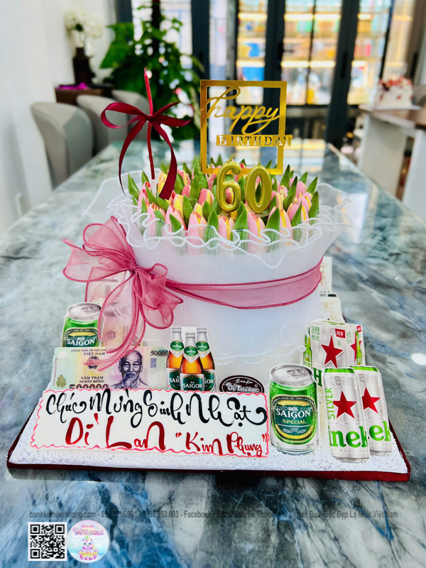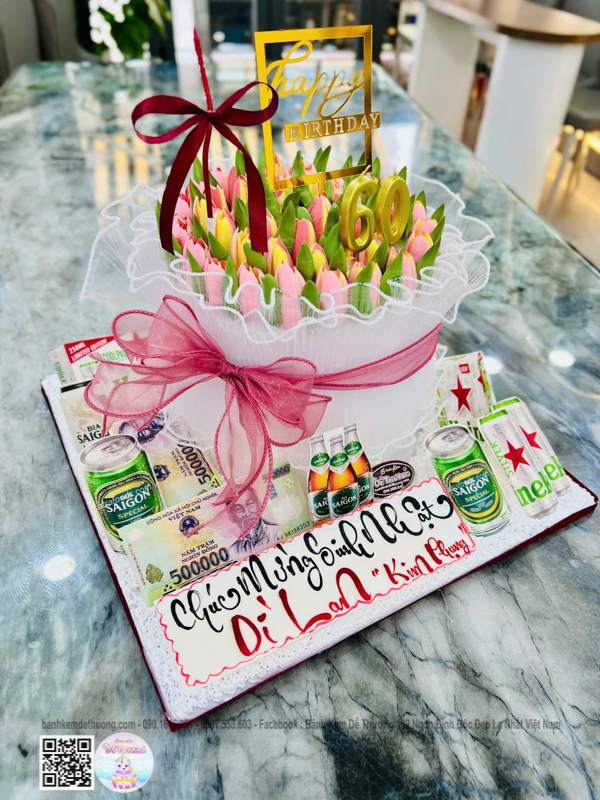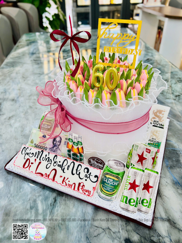 bánh kem bó hoa tu líp bia sài gòn rút tiền tặng dì lan dễ thương