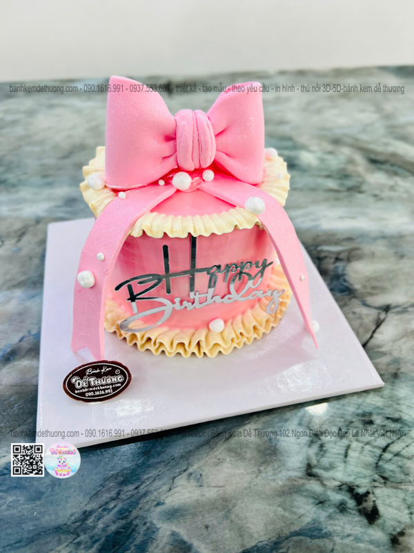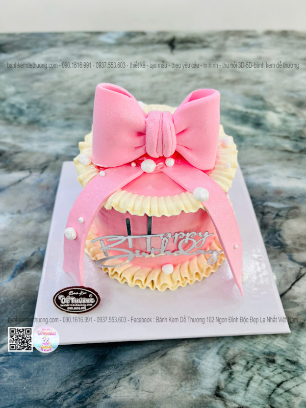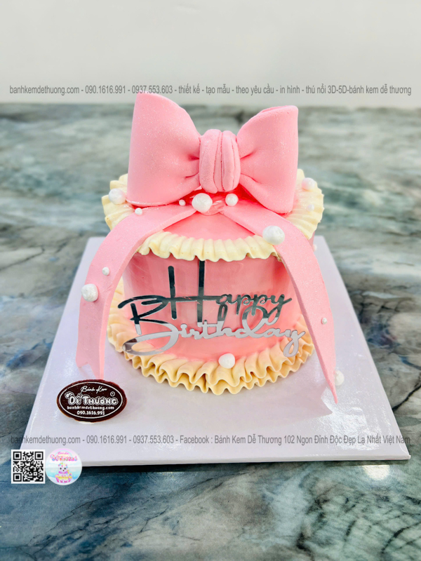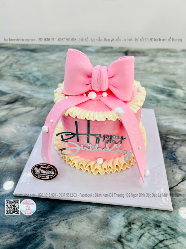 \bánh kem sinh nhật thắt nơ 3d màu hồng xinh xắn dễ thương