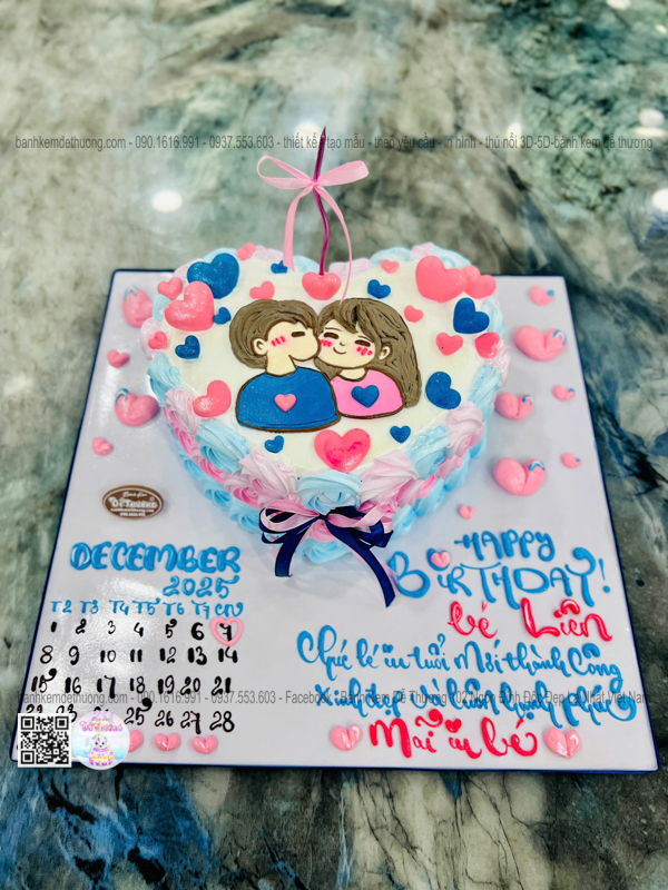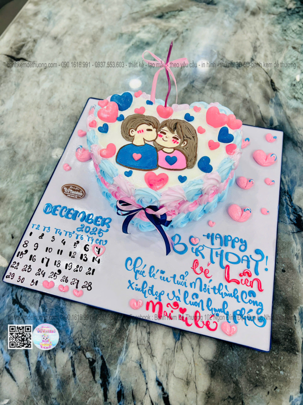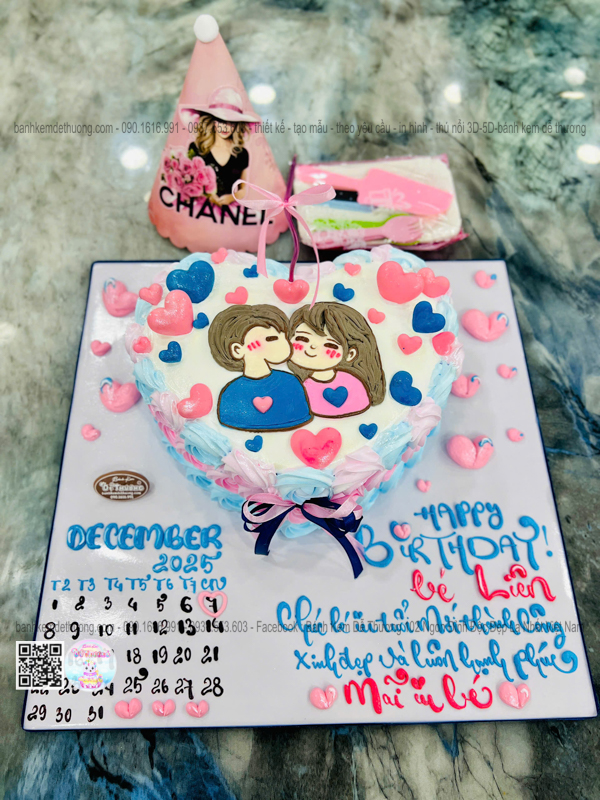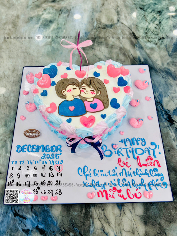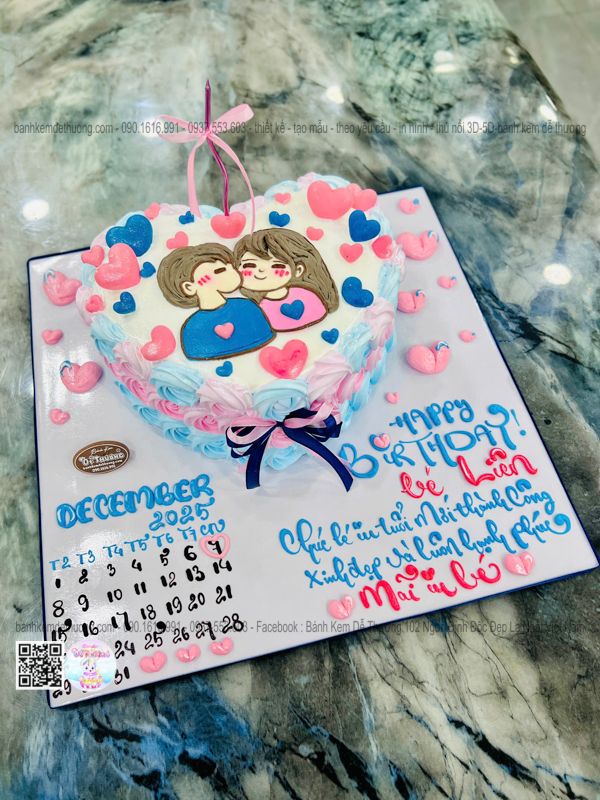 bánh kem sinh nhật trái tim vẽ hình nam nữ yêu nhau dễ thương